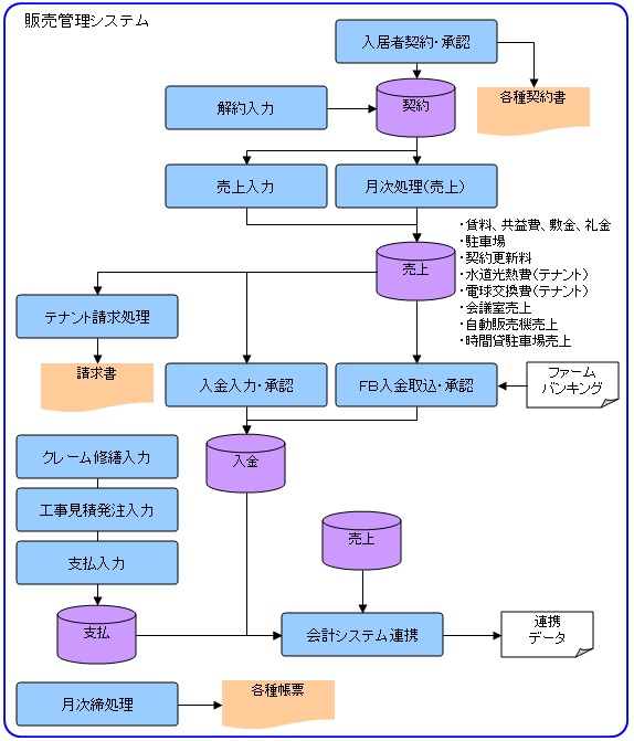 - 賃貸マンション、テナント(事務所)、月極駐車場などを運営する企業様にて、入居の契約から毎月の売上、回収、また経理システムへのデータ連携の一連業務をシステム化しました。
